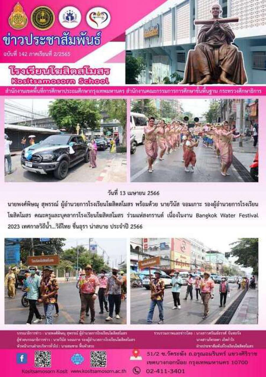นายพงศ์พิษณุ สุพรรณ์ ผู้อำนวยการโรงเรียนโฆสิตสโมสร พร้อมด้วย นายวีนัส จอมเกาะ รองผู้อำนวยการโรงเรียนโฆสิตโมสร คณะครูและบุคลากรโรงเรียนโฆสิตสโมสร ร่วมแห่สงกรานต์ เนื่องในงาน Bangkok Water Festival 2023 เทศกาลวิถีน้ำ...วิถีไทย ชื่นอุรา น่าสบาย ประจำปี 2566 S:0