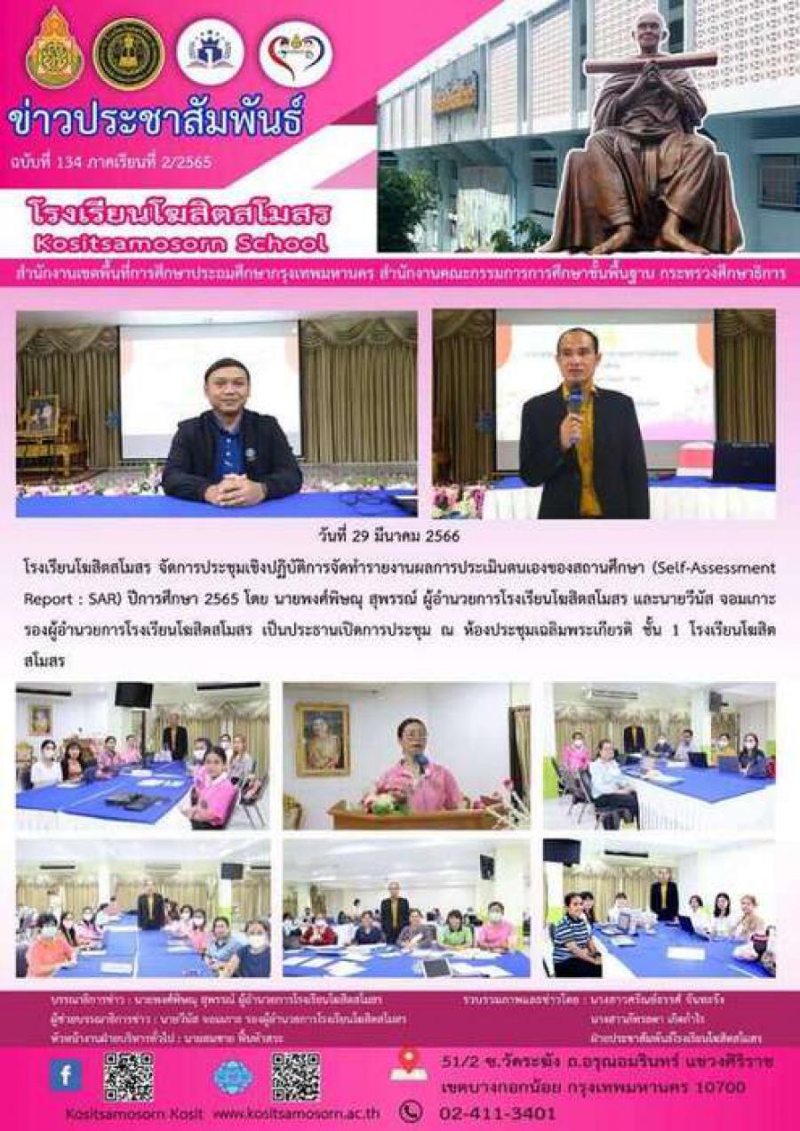 โรงเรียนโฆสิตสโมสร จัดการประชุมเชิงปฏิบัติการจัดทำรายงานผลการประเมินตนเองของสถานศึกษา (Self-Assessment Report : SAR) ปีการศึกษา 2565 โดย นายพงศ์พิษณุ สุพรรณ์ ผู้อำนวยการโรงเรียนโฆสิตสโมสร และนายวีนัส จอมเกาะ รองผู้อำนวยการโรงเรียนโฆสิตสโมสร เป็นประธานเปิดการประชุม ณ ห้องประชุมเฉลิมพระเกียรติ ชั้น 1 โรงเรียนโฆสิตสโมสร S:0