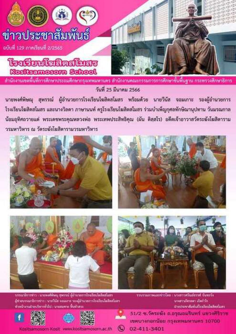 นายพงศ์พิษณุ สุพรรณ์ ผู้อำนวยการโรงเรียนโฆสิตสโมสร พร้อมด้วย นายวีนัส จอมเกาะ รองผู้อำนวยการโรงเรียนโฆสิตสโมสร และนางวิลดา ภาษานนท์ ครูโรงเรียนโฆสิตสโมสร ร่วมบำเพ็ญกุศลทักษิณานุปทาน วันมรณกาลน้อมอุทิศถวายแด่ พระเดชพระคุณหลวงพ่อ พระเทพประสิทธิคุณ (ผัน ติสฺสโร) อดีตเจ้าอาวาสวัดระฆังโฆสิตารามวรมหาวิหาร ณ วัดระฆังโฆสิตารามวรมหาวิหาร S:0