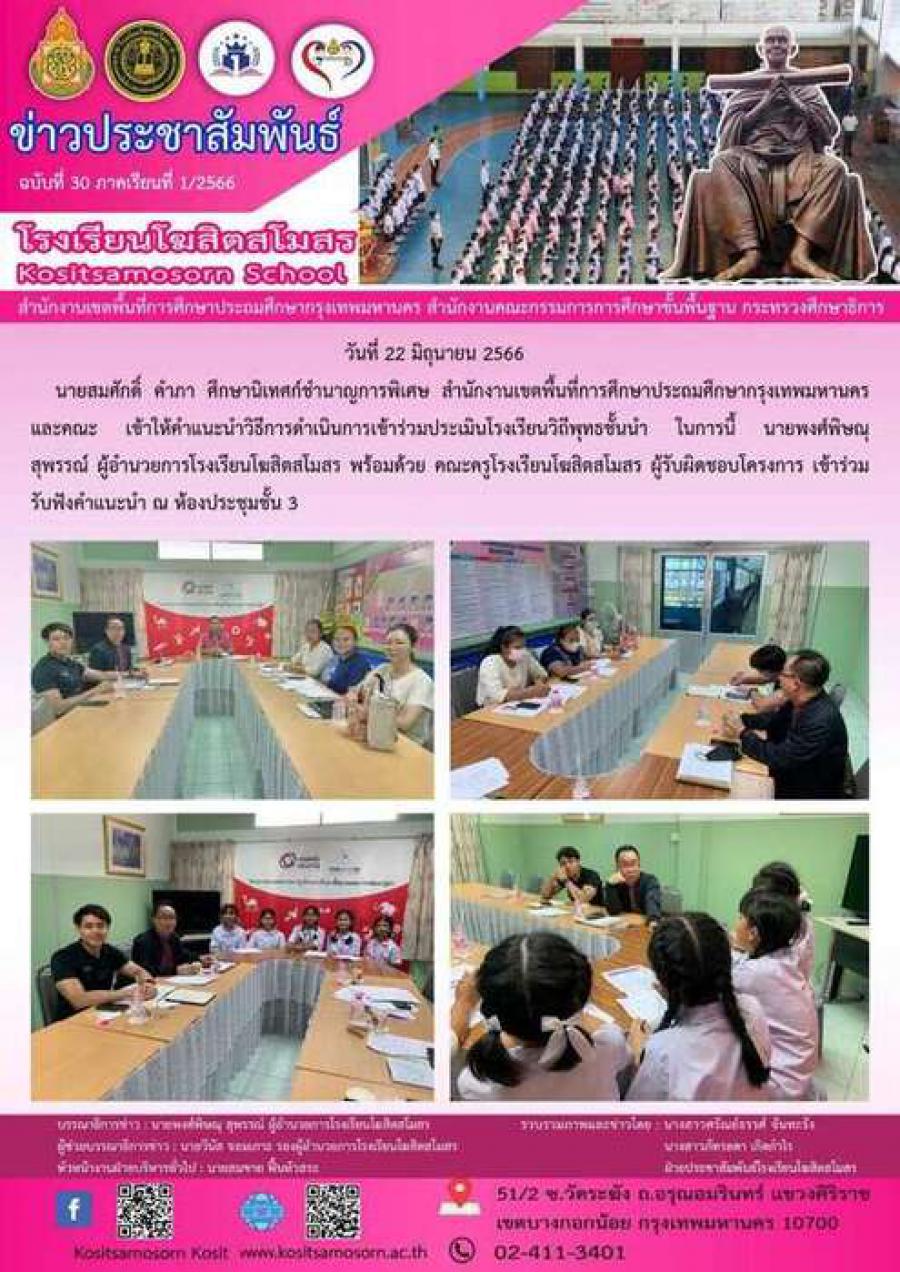 วันที่ 22 มิถุนายน 2566 นายสมศักดิ์ คำภา ศึกษานิเทศก์ชำนาญการพิเศษ สำนักงานเขตพื้นที่การศึกษาประถมศึกษากรุงเทพมหานคร และคณะ เข้าให้คำแนะนำวิธีการดำเนินการเข้าร่วมประเมินโรงเรียนวิถีพุทธชั้นนำ ในการนี้ นายพงศ์พิษณุ สุพรรณ์์ ผู้อำนวยการโรงเรียนโฆสิตสโมสร พร้อมด้วย คณะครูโรงเรียนโฆสิตสโมสร ผู้รับผิดชอบโครงการ เข้าร่วมรับฟังคำแนะนำ ณ ห้องประชุมชั้น 3 S:0