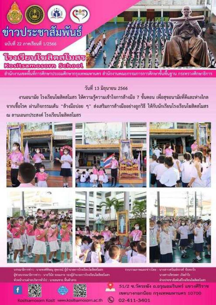 วันที่ 13 มิถุนายน 2566 งานอนามัย โรงเรียนโฆสิตสโมสร ให้ความรู้ความเข้าใจการล้างมือ 7 ขั้นตอน เพื่อสุขอนามัยที่ดีและห่างไกลจากเชื้อโรค ผ่านกิจกรรมเต้น ?ล้างมือบ่อย ๆ? ส่งเสริมการล้างมืออย่างถูกวิธี ให้กับนักเรียนโรงเรียนโฆสิตสโมสร ณ ลานเอนกประสงค์ โรงเรียนโฆสิตสโมสร S:0