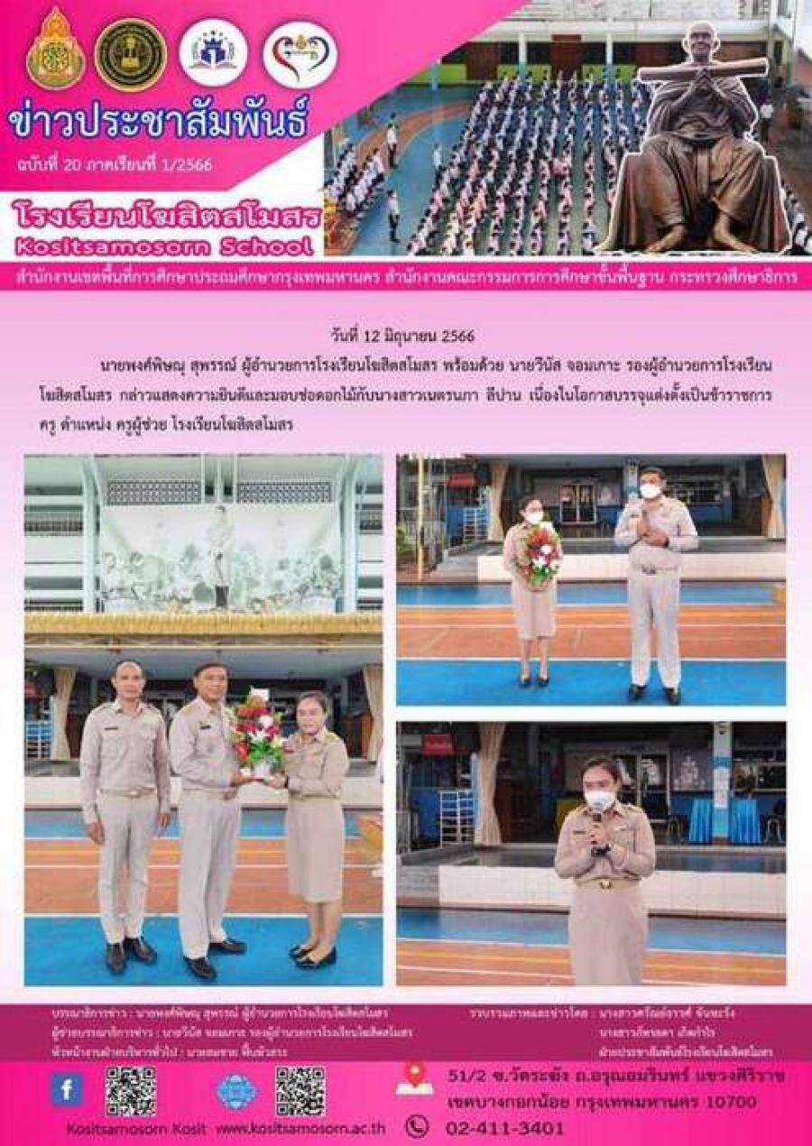 วันที่ 12 มิถุนายน 2566 นายพงศ์พิษณุ สุพรรณ์ ผู้อำนวยการโรงเรียนโฆสิตสโมสร พร้อมด้วย นายวีนัส จอมเกาะ รองผู้อำนวยการโรงเรียนโฆสิตสโมสร กล่าวแสดงความยินดีและมอบช่อดอกไม้กับนางสาวเนตรนภา ลีปาน เนื่องในโอกาสบรรจุแต่งตั้งเป็นข้าราชการครู ตำแหน่ง ครูผู้ช่วย โรงเรียนโฆสิตสโมสร S:0