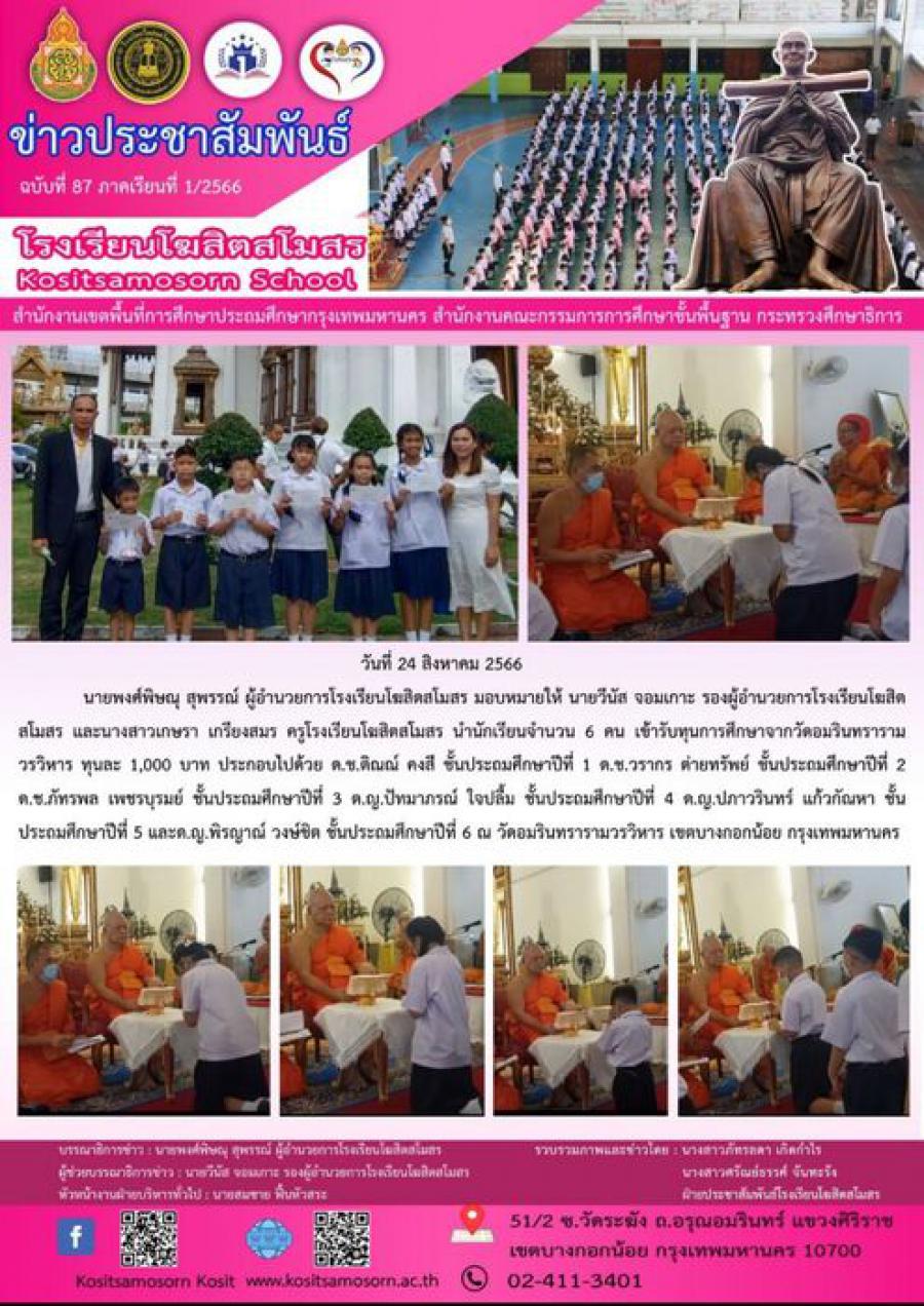 นายพงศ์พิษณุ สุพรรณ์ ผู้อำนวยการโรงเรียนโฆสิตสโมสร มอบหมายให้ นายวีนัส จอมเกาะ รองผู้อำนวยการโรงเรียนโฆสิตสโมสร และนางสาวเกษรา เกรียงสมร ครูโรงเรียนโฆสิตสโมสร นำนักเรียนจำนวน 6 คน เข้ารับทุนการศึกษาจากวัดอมรินทรารามวรวิหาร ทุนละ 1,000 บาท ประกอบไปด้วย ด.ช.ติณณ์ คงสี ชั้นประถมศึกษาปีที่ 1 ด.ช.วรากร ต่ายทรัพย์ ชั้นประถมศึกษาปีที่ 2 ด.ช.ภัทรพล เพชรบุรมย์ ชั้นประถมศึกษาปีที่ 3 ด.ญ.ปัทมาภรณ์ ใจปลื้ม ชั้นประถมศึกษาปีที่ 4 ด.ญ.ปภาวรินทร์ แก้วกัณหา ชั้นประถมศึกษาปีที่ 5 และด.ญ.พิรญาณ์ วงษ์ชิต ชั้นประถมศึกษาปีที่ 6 ณ วัดอมรินทรารามวรวิหาร เขตบางกอกน้อย กรุงเทพมหานคร S:0