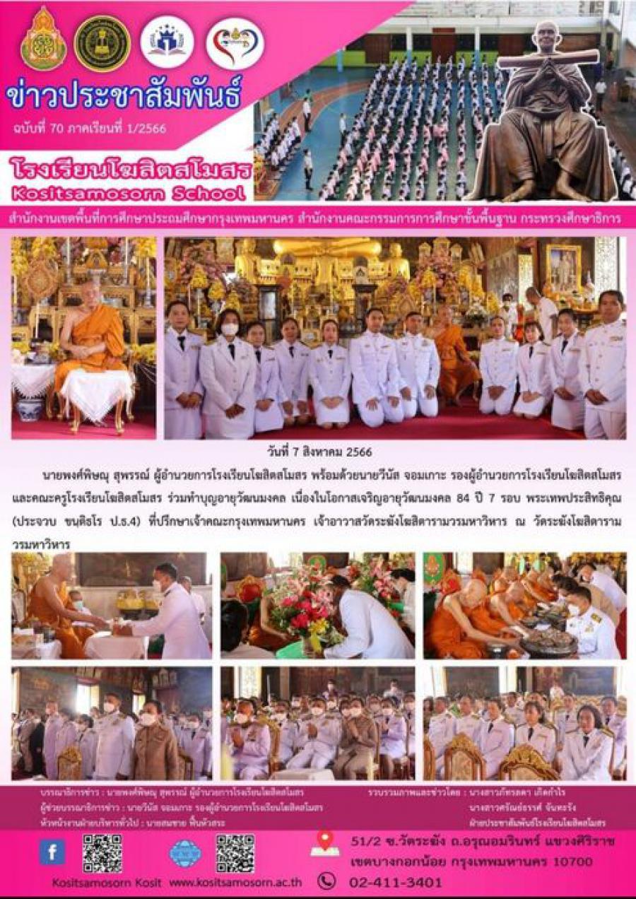 นายพงศ์พิษณุ สุพรรณ์ ผู้อำนวยการโรงเรียนโฆสิตสโมสร พร้อมด้วยนายวีนัส จอมเกาะ รองผู้อำนวยการโรงเรียนโฆสิตสโมสร และคณะครูโรงเรียนโฆสิตสโมสร ร่วมทำบุญอายุวัฒนมงคล เนื่องในโอกาสเจริญอายุวัฒนมงคล 84 ปี 7 รอบ พระเทพประสิทธิคุณ (ประจวบ ขนฺติธโร ป.ธ.4) ที่ปรึกษาเจ้าคณะกรุงเทพมหานคร เจ้าอาวาสวัดระฆังโฆสิตารามวรมหาวิหาร ณ วัดระฆังโฆสิตารามวรมหาวิหาร S:0