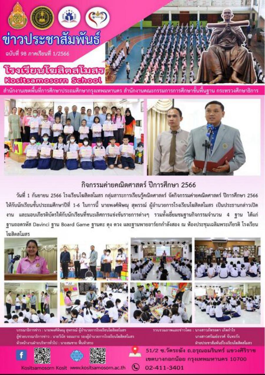 กิจกรรมค่ายคณิตศาสตร์ ปีการศึกษา 2566 วันที่ 1 กันยายน 2566 โรงเรียนโฆสิตสโมสร กลุ่มสาระการเรียนรู้คณิตศาสตร์ จัดกิจกรรมค่ายคณิตศาสตร์ ปีการศึกษา 2566 ให้กับนักเรียนชั้นประถมศึกษาปีที่ 1-6 ในการนี้ นายพงศ์พิษณุ สุพรรณ์ ผู้อำนวยการโรงเรียนโฆสิตสโมสร เป็นประธานกล่าวเปิดงาน และมอบเกียรติบัตรให้กับนักเรียนที่ชนะเลิศการแข่งขันรายการต่างๆ รวมทั้งเยี่ยมชมฐานกิจกรรมจำนวน 4 ฐาน ได้แก่ ฐานถอดรหัส Davinci ฐาน Board Game ฐานตะ ตุง ตวง และฐานพายอาร์ยกกำลังสอง ณ ห้องประชุมเฉลิมพระเกียรติ โรงเรียนโฆสิตสโมสร S:0