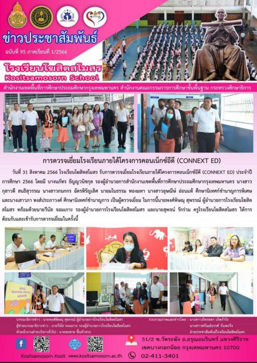 การตวรจเยี่ยมโรงเรียนภายใต้โครงการคอนเน็กซ์อีดี (CONNEXT ED) วันที่ 31 สิงหาคม 2566 โรงเรียนโฆสิตสโมสร รับการตวรจเยี่ยมโรงเรียนภายใต้โครงการคอนเน็กซ์อีดี (CONNEXT ED) ประจำปีการศึกษา 2566 โดยมี นางนภัทร ธัญญวนิชกุล รองผู้อำนวยการสำนักงานเขตพื้นที่การศึกษาประถมศึกษากรุงเทพมหานคร นางสาว กุสาวดี สนธิสุวรรณ นางสาวกนกกร ฉัตรหิรัญเลิศ นายมโนธรรม ทองมหา นางสาวอุษณีษ์ อ่อนแท้ ศึกษานิเทศก์ชำนาญการพิเศษ และนางเสาวภา หงส์ประภาวงศ์ ศึกษานิเทศก์ชำนาญการ เป็นผู้ตรวจเยี่ยม ในการนี้นายพงศ์พิษณุ สุพรรณ์ ผู้อำนวยการโรงเรียนโฆสิตสโมสร พร้อมด้วยนายวีนัส จอมเกาะ รองผู้อำนวยการโรงเรียนโฆสิตสโมสร และนายสุพจน์ รักร่วม ครูโรงเรียนโฆสิตสโมสร ให้การต้อนรับและเข้ารับการตวรจเยี่ยมในครั้งนี้ S:0
