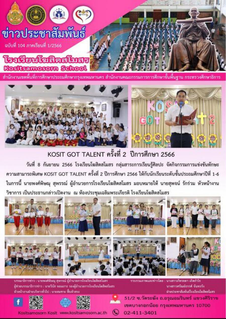 KOSIT GOT TALENT ครั้งที่ 2 ปีการศึกษา 2566 วันที่ 8 กันยายน 2566 โรงเรียนโฆสิตสโมสร กลุ่มสาระการเรียนรู้ศิลปะ จัดกิจกรรมการแข่งขันทักษะความสามารถพิเศษ KOSIT GOT TALENT ครั้งที่ 2 ปีการศึกษา 2566 ให้กับนักเรียนระดับชั้นประถมศึกษาปีที่ 1-6 ในการนี้ นายพงศ์พิษณุ สุพรรณ์ ผู้อำนวยการโรงเรียนโฆสิตสโมสร มอบหมายให้ นายสุพจน์ รักร่วม หัวหน้างานวิชาการ เป็นประธานกล่าวเปิดงาน ณ ห้องประชุมเฉลิมพระเกียรติ โรงเรียนโฆสิตสโมสร S:0
