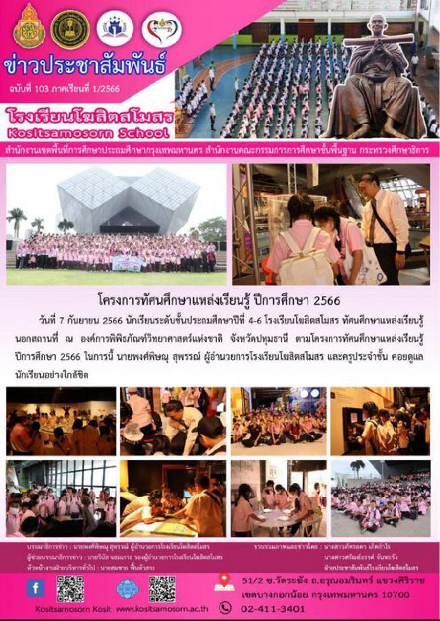 โครงการทัศนศึกษาแหล่งเรียนรู้ ปีการศึกษา 2566 วันที่ 7 กันยายน 2566 นักเรียนระดับชั้นประถมศึกษาปีที่ 4-6 โรงเรียนโฆสิตสโมสร ทัศนศึกษาแหล่งเรียนรู้นอกสถานที่ ณ องค์การพิพิธภัณฑ์วิทยาศาสตร์แห่งชาติ จังหวัดปทุมธานี ตามโครงการทัศนศึกษาแหล่งเรียนรู้ ปีการศึกษา 2566 ในการนี้ นายพงศ์พิษณุ สุพรรณ์ ผู้อำนวยการโรงเรียนโฆสิตสโมสร และครูประจำชั้น คอยดูแลนักเรียนอย่างใกล้ชิด S:0