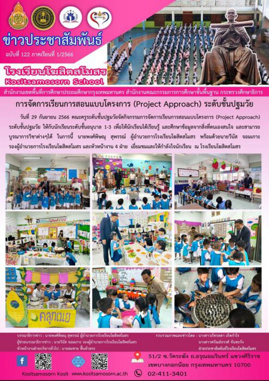 การจัดการเรียนการสอนแบบโครงการ (Project Approach) ระดับชั้นปฐมวัย วันที่ 29 กันยายน 2566 คณะครูระดับชั้นปฐมวัยจัดกิจกรรมการจัดการเรียนการสอนแบบโครงการ (Project Approach) ระดับชั้นปฐมวัย ให้กับนักเรียนระดับชั้นอนุบาล 1-3 เพื่อให้นักเรียนได้เรียนรู้ และศึกษาข้อมูลจากสิ่งที่ตนเองสนใจ และสามารถบูรณาการวิชาต่างๆได้ ในการนี้ นายพงศ์พิษณุ สุพรรณ์ ผู้อำนวยการโรงเรียนโฆสิตสโมสร พร้อมด้วยนายวีนัส จอมเกาะ รองผู้อำนวยการโรงเรียนโฆสิตสโมสร และหัวหน้างาน 4 ฝ่าย เยี่ยมชมและให้กำลังใจนักเรียน ณ โรงเรียนโฆสิตสโมสร S:0