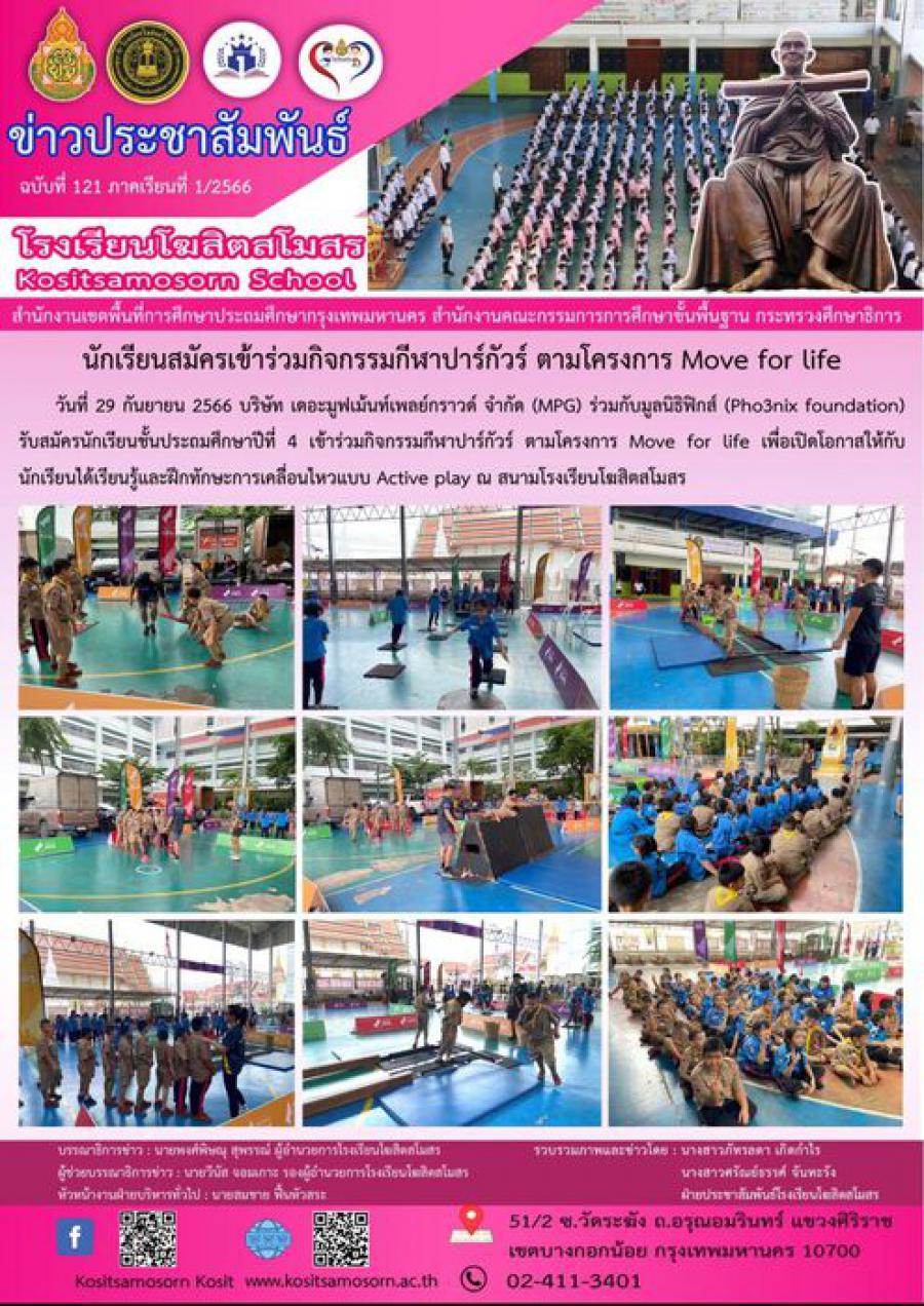 นักเรียนสมัครเข้าร่วมกิจกรรมกีฬาปาร์กัวร์ ตามโครงการ Move for life วันที่ 29 กันยายน 2566 บริษัท เดอะมูฟเม้นท์เพลย์กราวด์ จำกัด (MPG) ร่วมกับมูลนิธิฟิกส์ (Pho3nix foundation) รับสมัครนักเรียนชั้นประถมศึกษาปีที่ 4 เข้าร่วมกิจกรรมกีฬาปาร์กัวร์ ตามโครงการ Move for life เพื่อเปิดโอกาสให้กับนักเรียนได้เรียนรู้และฝึกทักษะการเคลื่ิอนไหวแบบ Active play ณ สนามโรงเรียนโฆสิตสโมสร S:0