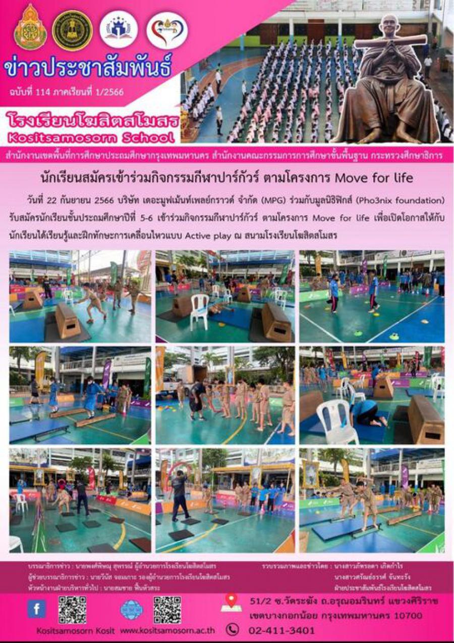 นักเรียนสมัครเข้าร่วมกิจกรรมกีฬาปาร์กัวร์ ตามโครงการ Move for life วันที่ 22 กันยายน 2566 บริษัท เดอะมูฟเม้นท์เพลย์กราวด์ จำกัด (MPG) ร่วมกับมูลนิธิฟิกส์ (Pho3nix foundation) รับสมัครนักเรียนชั้นประถมศึกษาปีที่ 5-6 เข้าร่วมกิจกรรมกีฬาปาร์กัวร์ ตามโครงการ Move for life เพื่อเปิดโอกาสให้กับนักเรียนได้เรียนรู้และฝึกทักษะการเคลื่อนไหวแบบ Active play ณ สนามโรงเรียนโฆสิตสโมสร S:0