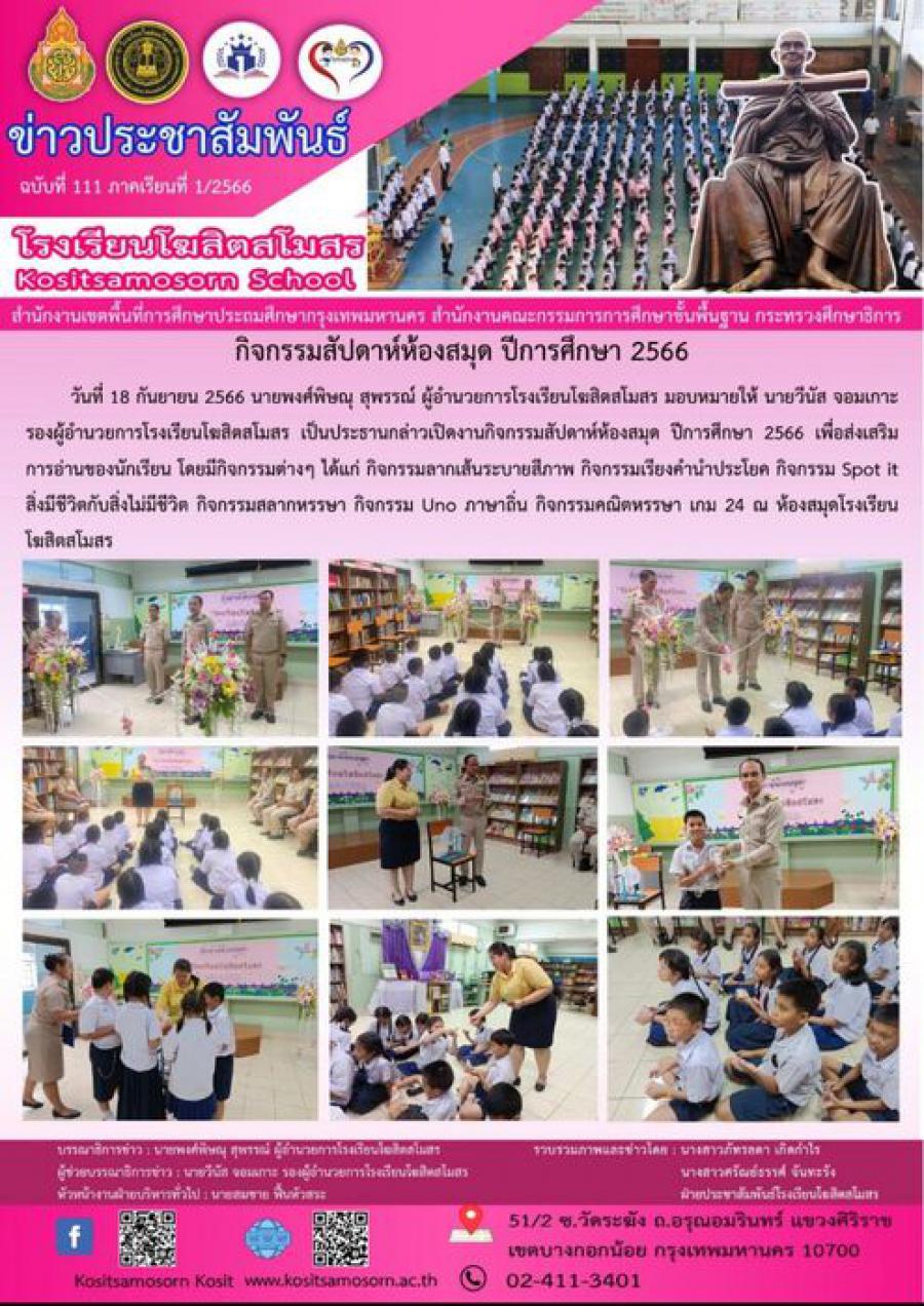 กิจกรรมสัปดาห์ห้องสมุด ปีการศึกษา 2566 วันที่ 18 กันยายน 2566 นายพงศ์พิษณุ สุพรรณ์ ผู้อำนวยการโรงเรียนโฆสิตสโมสร มอบหมายให้ นายวีนัส จอมเกาะ รองผู้อำนวยการโรงเรียนโฆสิตสโมสร เป็นประธานกล่าวเปิดงานกิจกรรมสัปดาห์ห้องสมุด ปีการศึกษา 2566 เพื่อส่งเสริมการอ่านของนักเรียน โดยมีกิจกรรมต่างๆ ได้แก่ กิจกรรมลากเส้นระบายสีภาพ กิจกรรมเรียงคำนำประโยค กิจกรรม Spot it สิ่งมีชีวิตกับสิ่งไม่มีชีวิต กิจกรรมสลากหรรษา กิจกรรม Uno ภาษาถิ่น กิจกรรมคณิตหรรษา เกม 24 ณ ห้องสมุดโรงเรียน โฆสิตสโมสร S:0