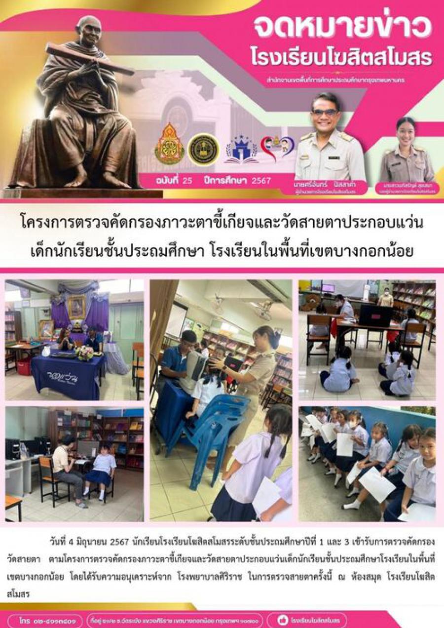 โครงการตรวจคัดกรองภาวะตาขี้เกียจและวัดสายตาประกอบแว่น เด็กนักเรียนชั้นประถมศึกษา โรงเรียนในพื้นที่เขตบางกอกน้อย วันที่ 4 มิถุนายน 2567 นักเรียนโรงเรียนโฆสิตสโมสรระดับชั้นประถมศึกษาปีที่ 1 และ 3 เข้ารับการตรวจคัดกรองวัดสายตา ตามโครงการตรวจคัดกรองภาวะตาขี้เกียจและวัดสายตาประกอบแว่นเด็กนักเรียนชั้นประถมศึกษาโรงเรียนในพื้นที่เขตบางกอกน้อย โดยได้รับความอนุเคราะห์จาก โรงพยาบาลศิริราช ในการตรวจสายตาครั้งนี้ ณ ห้องสมุด โรงเรียนโฆสิตสโมสร S:0