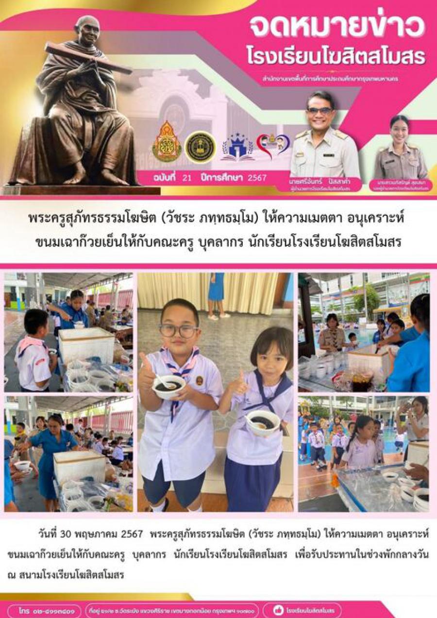 พระครูสุภัทรธรรมโฆษิต (วัชระ ภทฺทธมฺโม) ให้ความเมตตา อนุเคราะห์ ขนมเฉาก๊วยเย็นให้กับคณะครู บุคลากร นักเรียนโรงเรียนโฆสิตสโมสร วันที่ 30 พฤษภาคม 2567 พระครูสุภัทรธรรมโฆษิต (วัชระ ภทฺทธมฺโม) ให้ความเมตตา อนุเคราะห์ ขนมเฉาก๊วยเย็นให้กับคณะครู บุคลากร นักเรียนโรงเรียนโฆสิตสโมสร เพื่อรับประทานในช่วงพักกลางวัน ณ สนามโรงเรียนโฆสิตสโมสร S:0