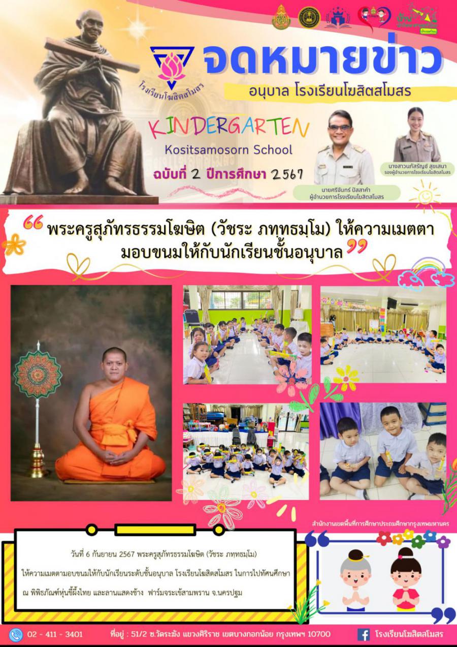 พระครูสุภัทรธรรมโฆษิต (วัชระ ภทฺทธมฺโม) ให้ความเมตตามอบขนมให้กับนักเรียนชั้นอนุบาล