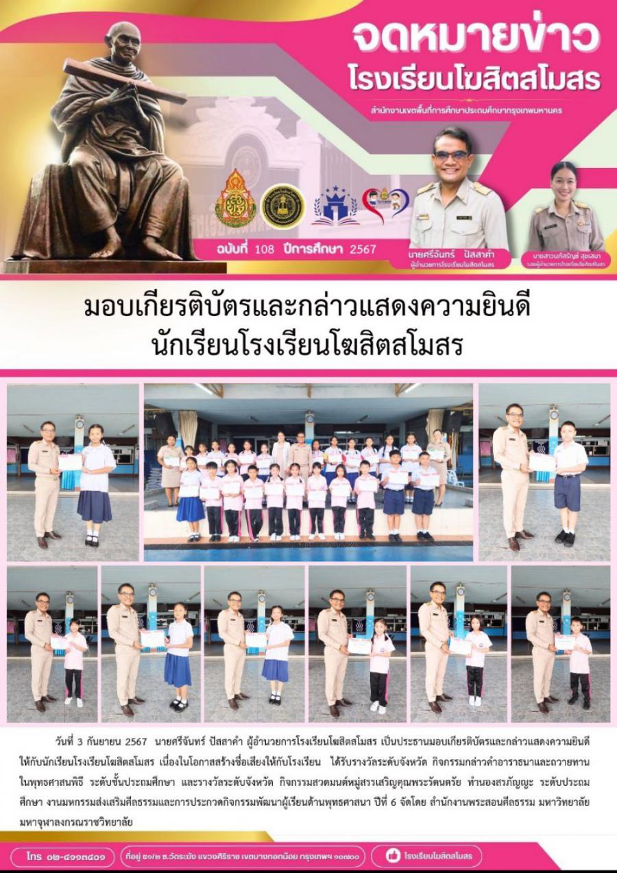 มอบเกียรติบัตรและกล่าวแสดงความยินดีนักเรียนโรงเรียนโฆสิตสโมสร S:0
